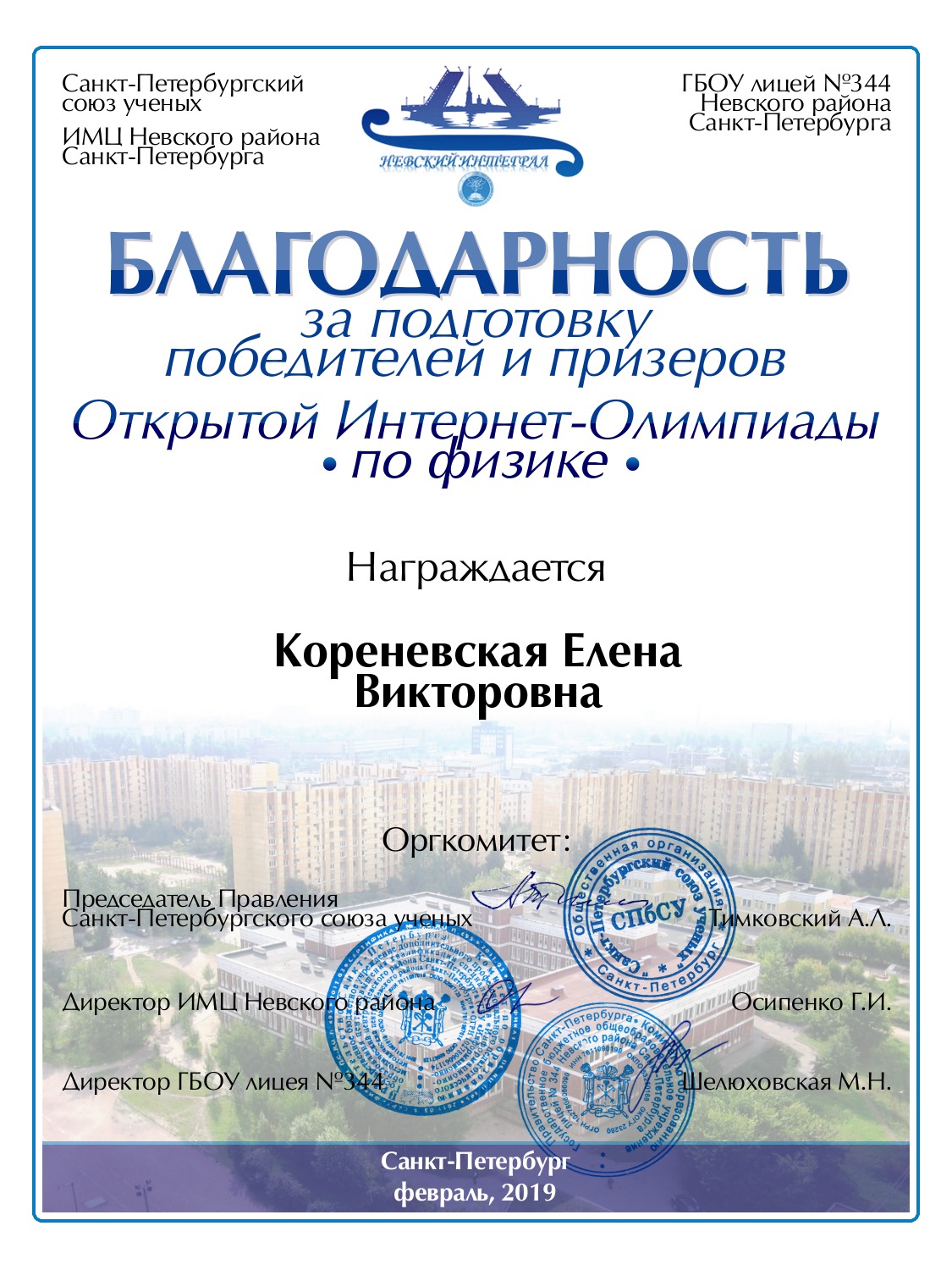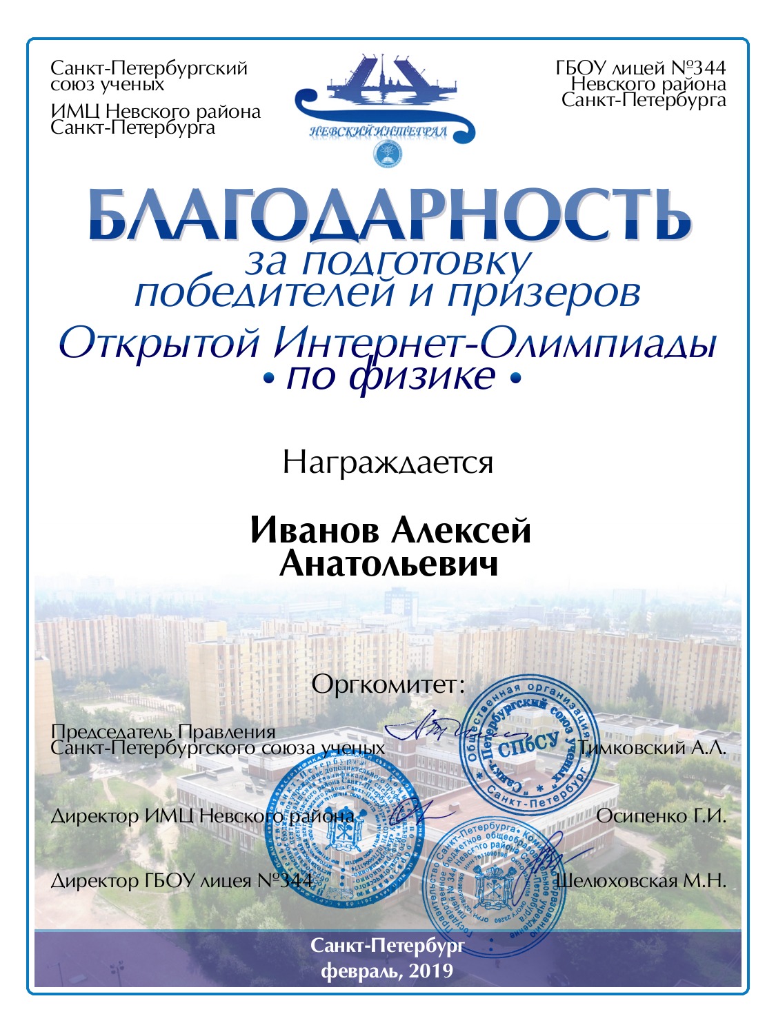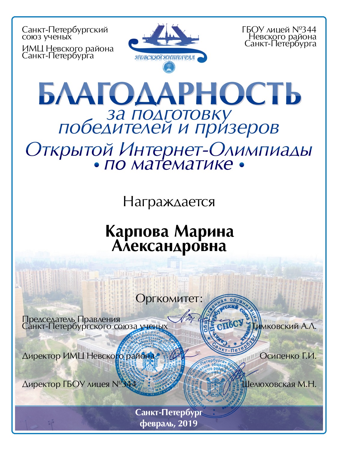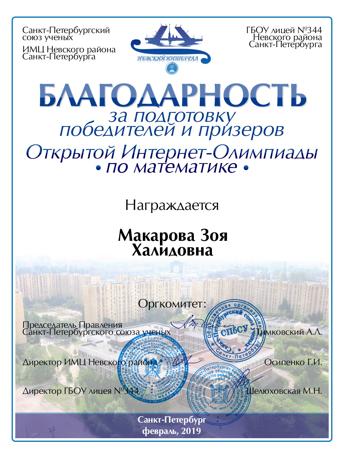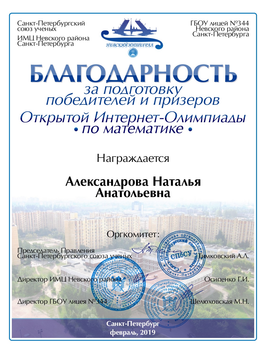 Благодарность оргкомитета получают учителя, подготовившие трех и более победителей и призеров интернет-олимпиады "Невский интеграл"