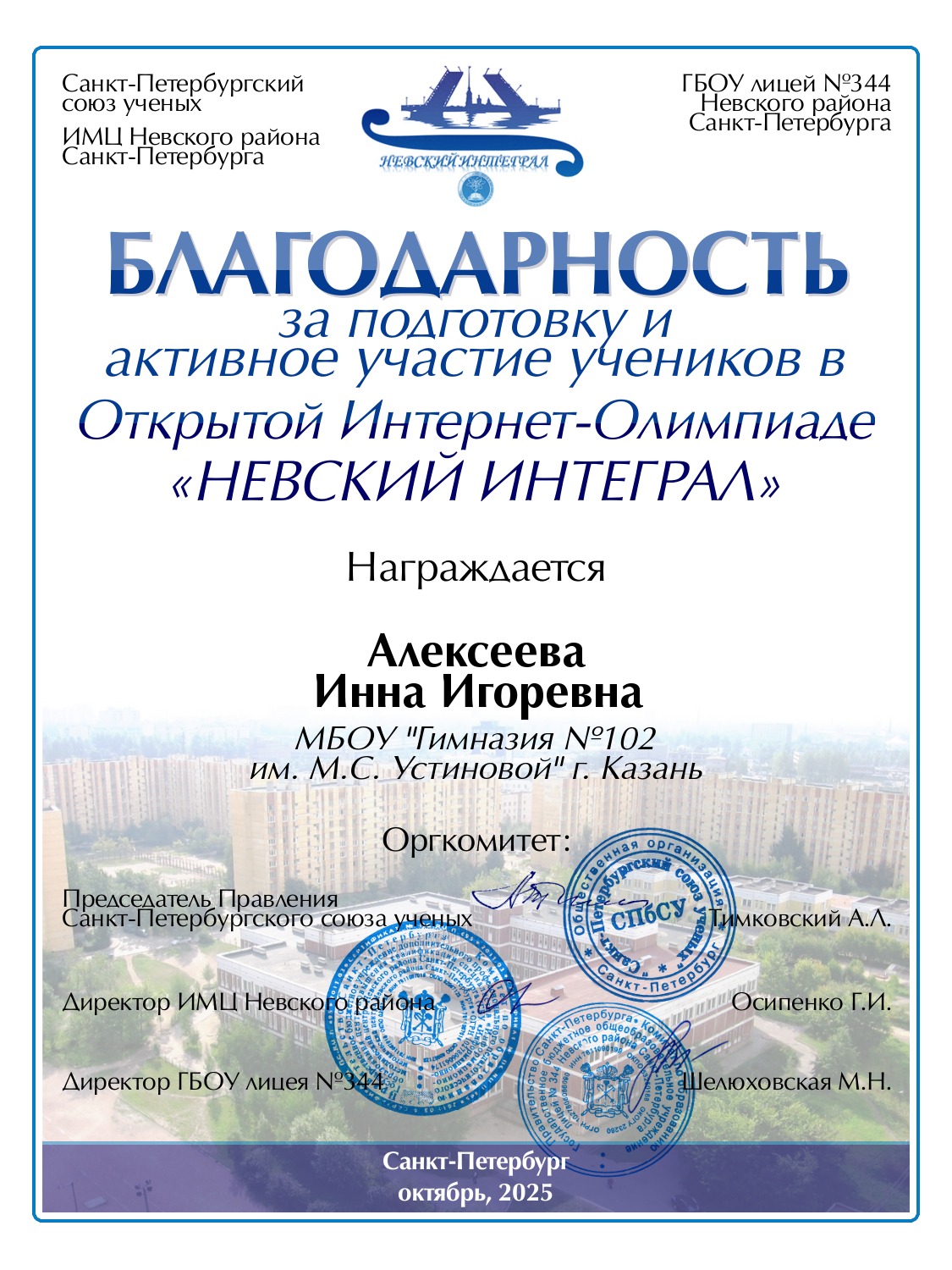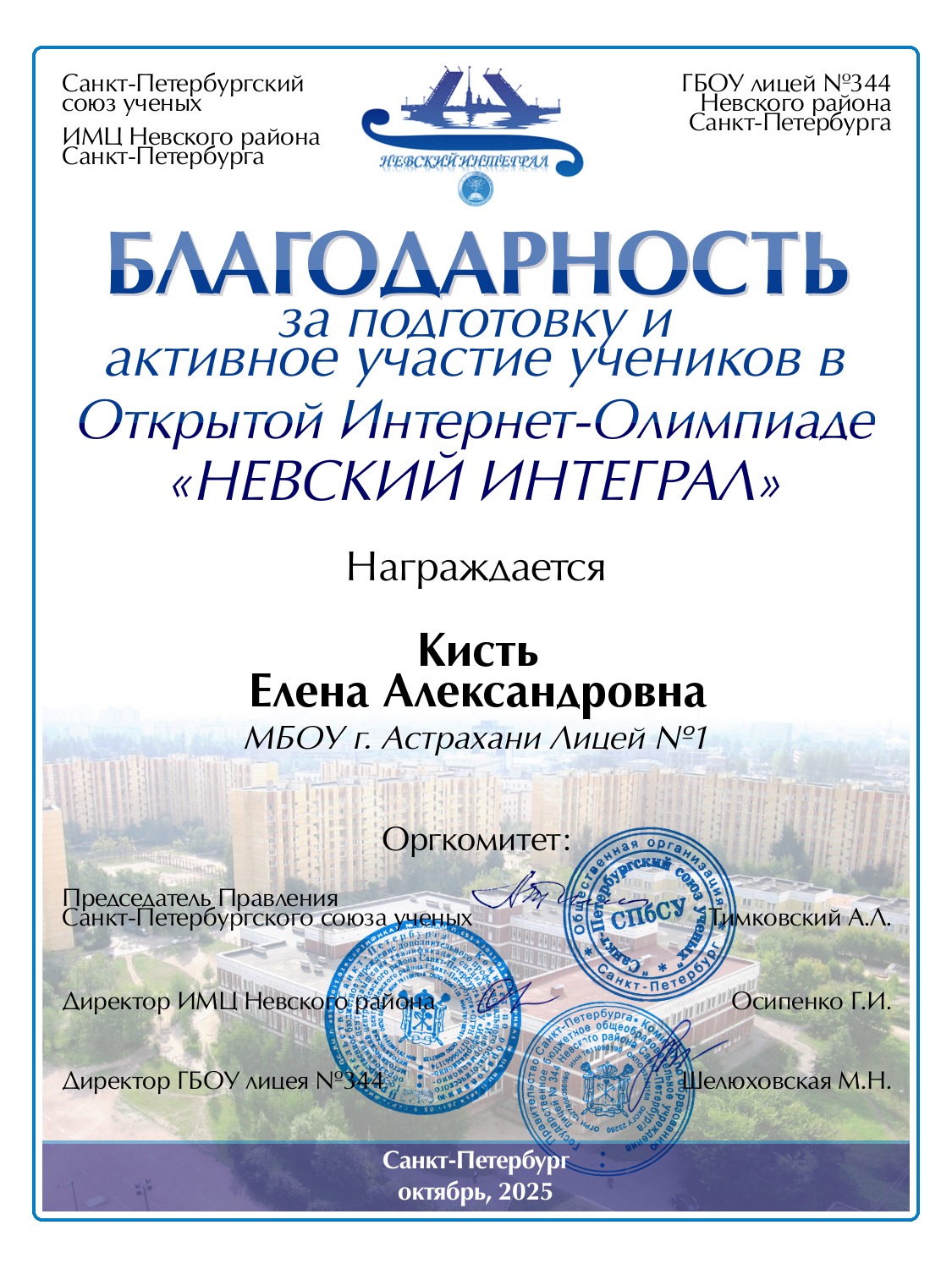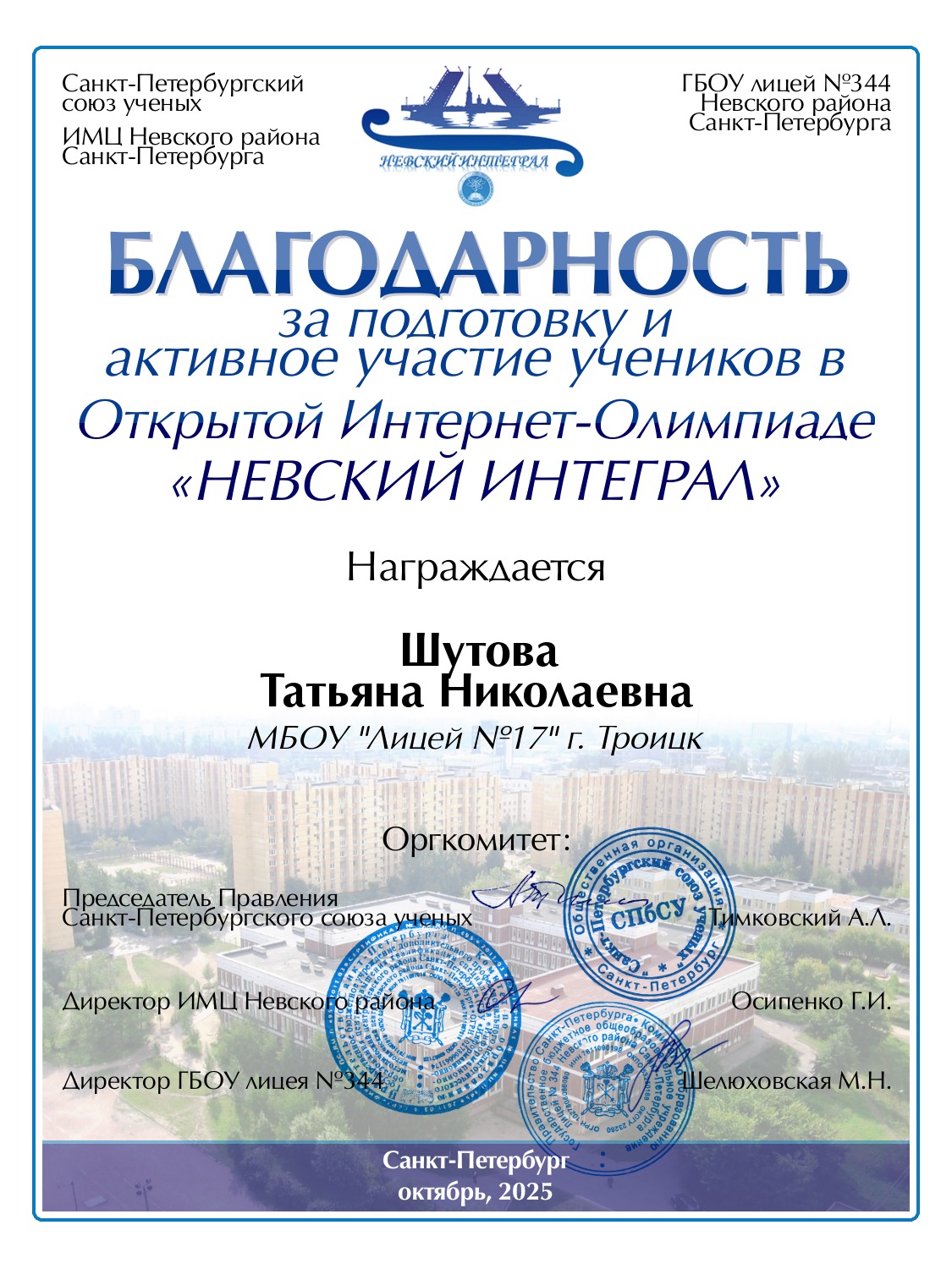 Благодарность оргкомитета получают учителя, подготовившие от десяти и более участников интернет-олимпиады "Невский интеграл"