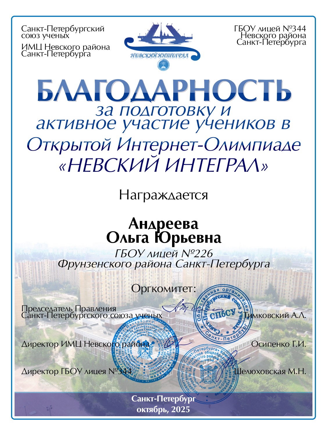| Андреева | Ольга | Юрьевна | Санкт-Петербург | Благодарность |