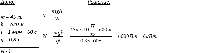 2. Какую среднюю мощность развивает волшебный двигатель «Нимбус-2000», если Гарри Поттер массой 45 кг поднимается на высоту 680 м за одну минуту? Ответ выразить в киловаттах. КПД метлы 85%. Гарри взлетает вертикально. Ускорение свободного падения g=10 м/с2.