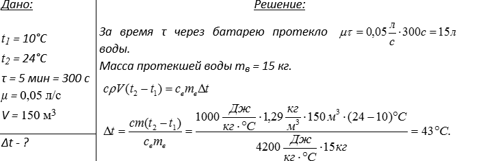 4. Обнаружив, что температура воздуха в одной из комнат подземелья составила 10°С, Филч включил отопление. Через 5 минут в комнате установилась температура воздуха, равная 24°С. Расход воды через батарею составил 0,05 л/с. На сколько градусов остыла вода в батарее, если объем комнаты 150 м3? Плотность воздуха 1,29 кг/м3, плотность воды 1000 кг/м3, удельная теплоемкость воздуха 1000 Дж/(кг•°С), удельная теплоемкость воды 4200 Дж/(кг•°С).