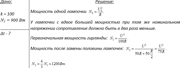 5. У Хагрида есть елочная гирлянда на 100 одинаковых лампочек с общей потребляемой мощностью 900 Вт. При включении ее в сеть все лампы горят нормальным накалом. Хагрид решил увеличить мощность гирлянды и каждую вторую лампочку заменил на лампочку с вдвое большей мощностью (при таком же номинальном напряжении). Какова теперь мощность гирлянды, если она включена в сеть с тем же общим напряжением? Ответ выразить в ваттах.