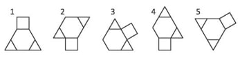 Нолик играет с мозаикой, в которой есть треугольные, квадратные и шестиугольные кусочки. Он сложил из них пять фигур (см. рисунок). Какие из этих фигур одинаковые?