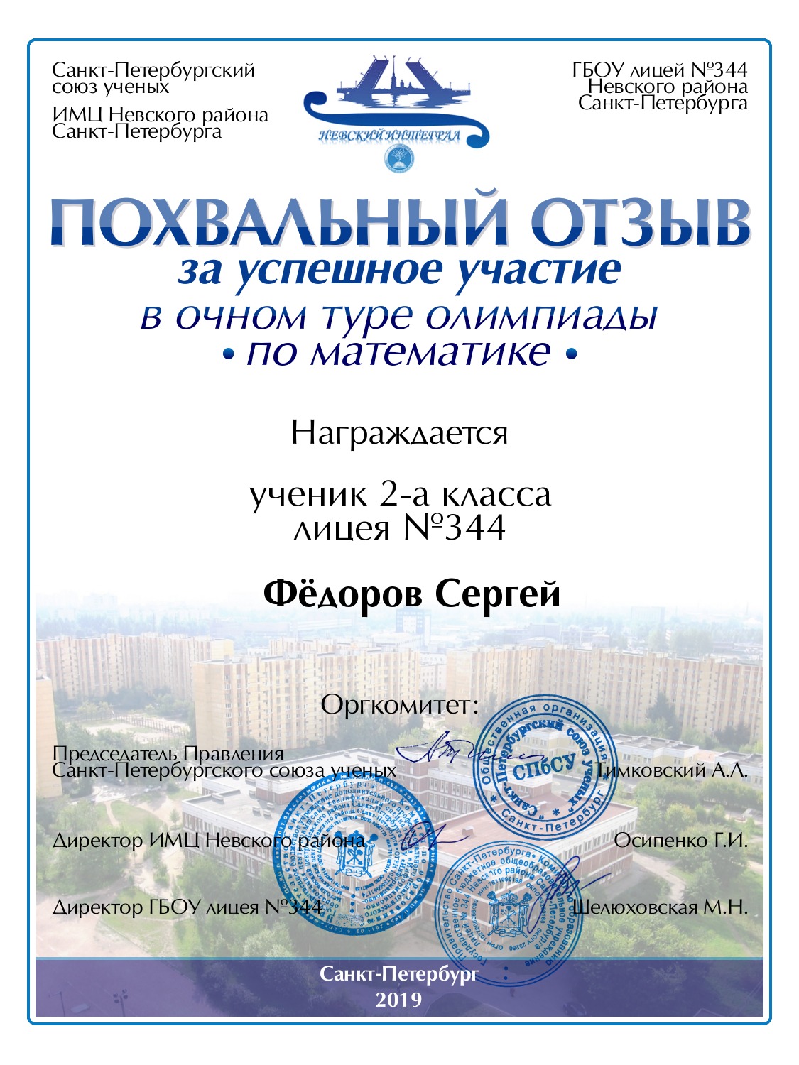 Фёдоров Сергей 344 2-а 17 Похвальный отзыв