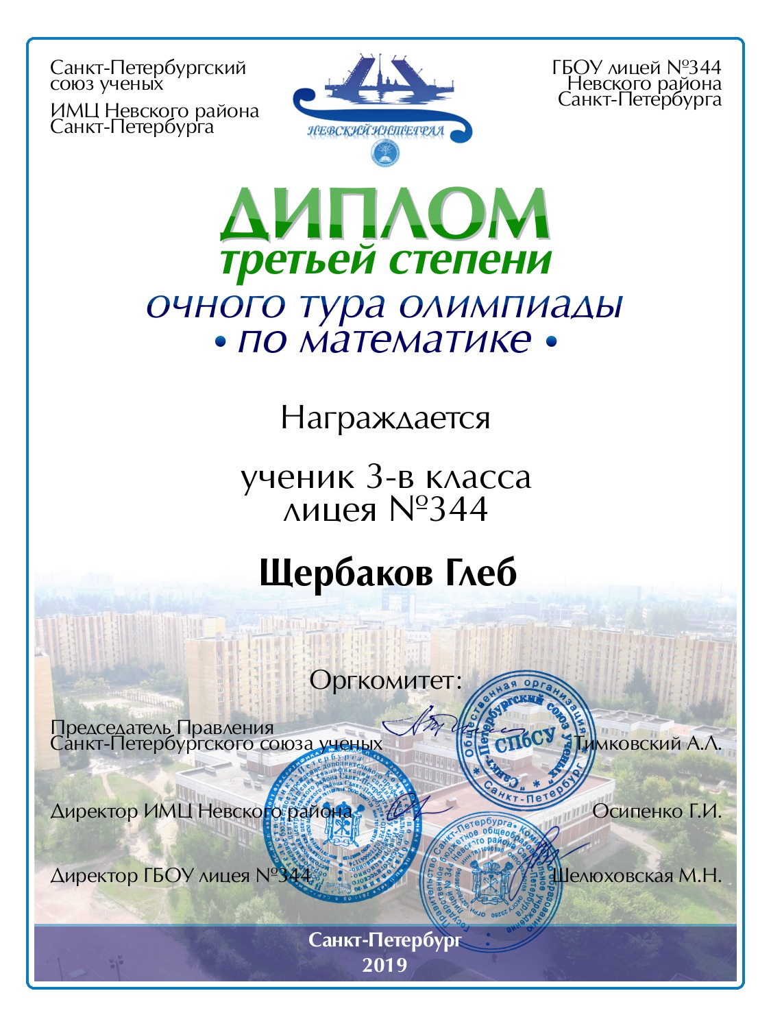 Щербаков Глеб 344 3-в 18 Диплом 3 степени
