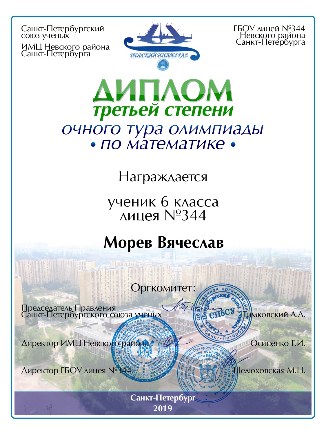 Морев Вячеслав 344 6 14 Диплом 3 степени