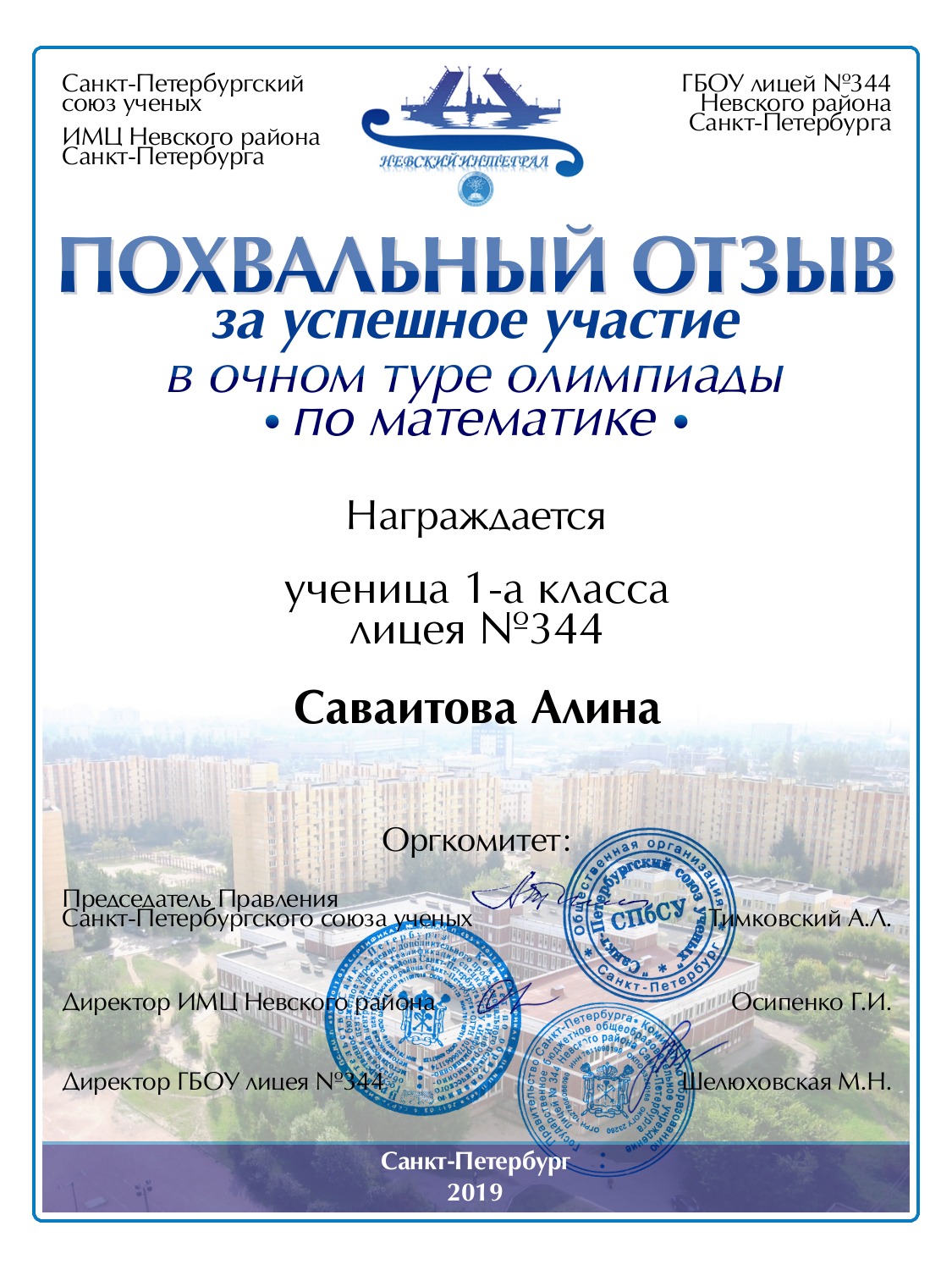 Саваитова Алина 344 1-а 12 Похвальный отзыв
