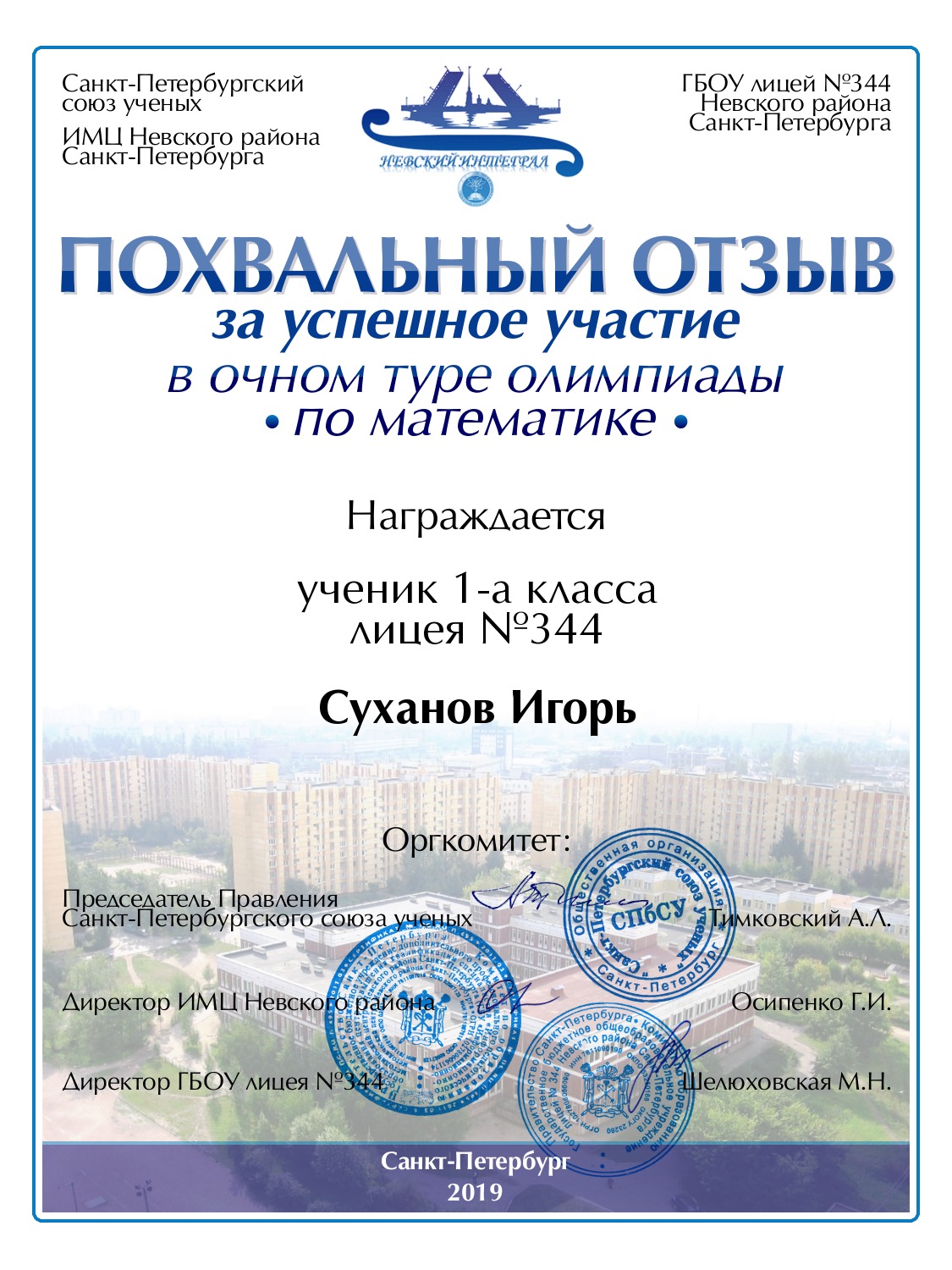 Суханов Игорь 344 1-а 12 Похвальный отзыв