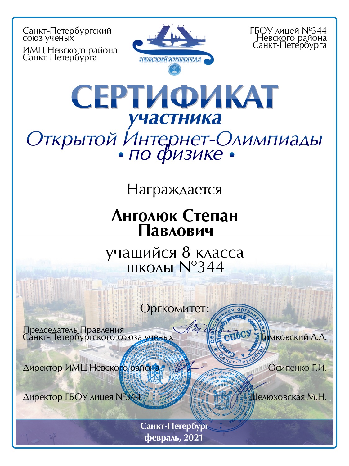 | Анголюк | Степан | Павлович | Санкт-Петербург | 344 | 8 | 20 | Сертификат |