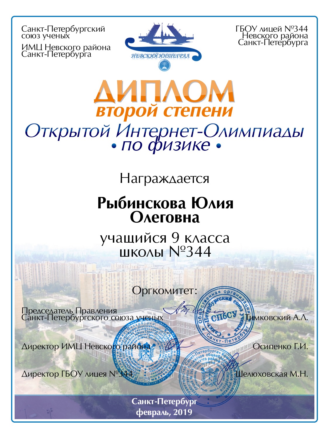 Рыбинскова Юлия Олеговна Санкт-Петербург 344 9 80 Диплом 2 степени