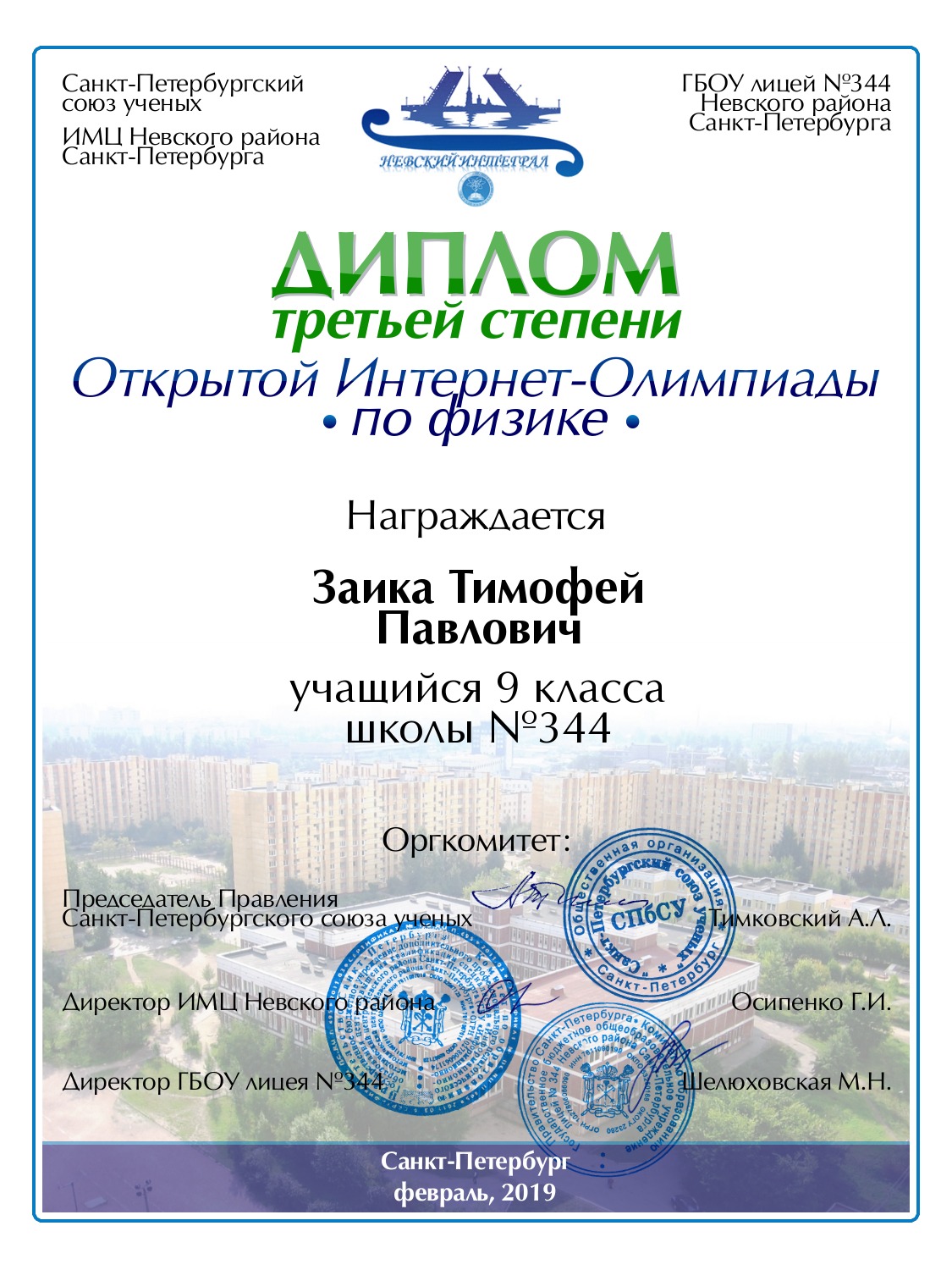 Заика Тимофей Павлович Санкт-Петербург 344 9 60 Диплом 3 степени
