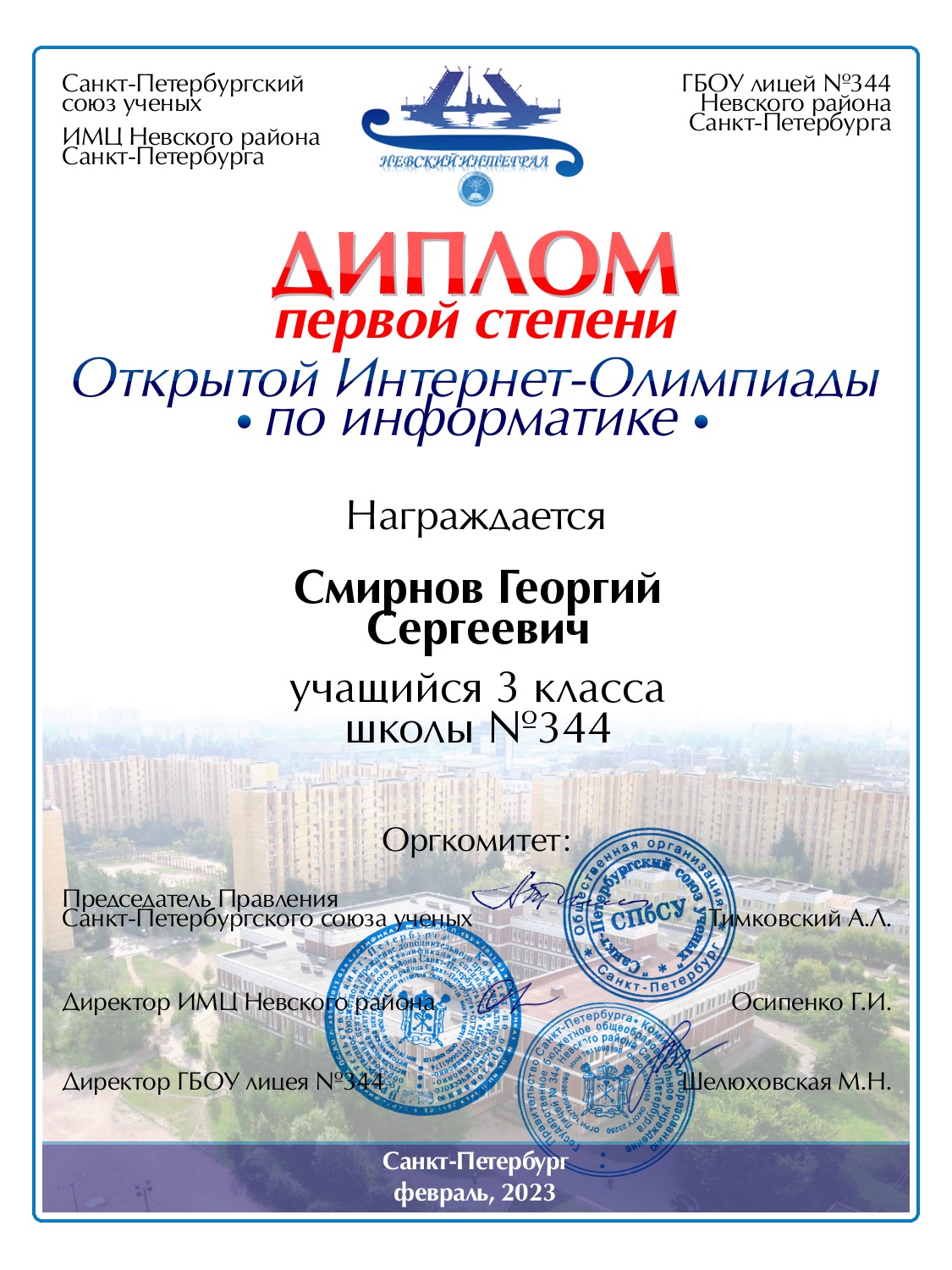 | Смирнов | Георгий | Сергеевич | Санкт-Петербург | 344 | 3 | 100 | Диплом 1 степени |