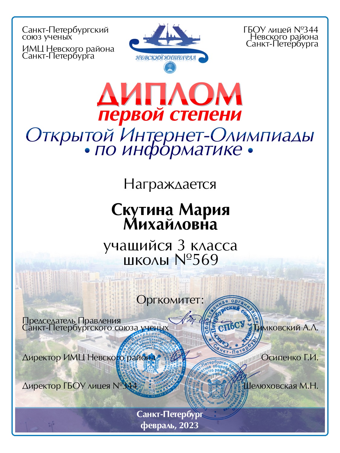| Скутина | Мария | Михайловна | Санкт-Петербург | 569 | 3 | 100 | Диплом 1 степени |