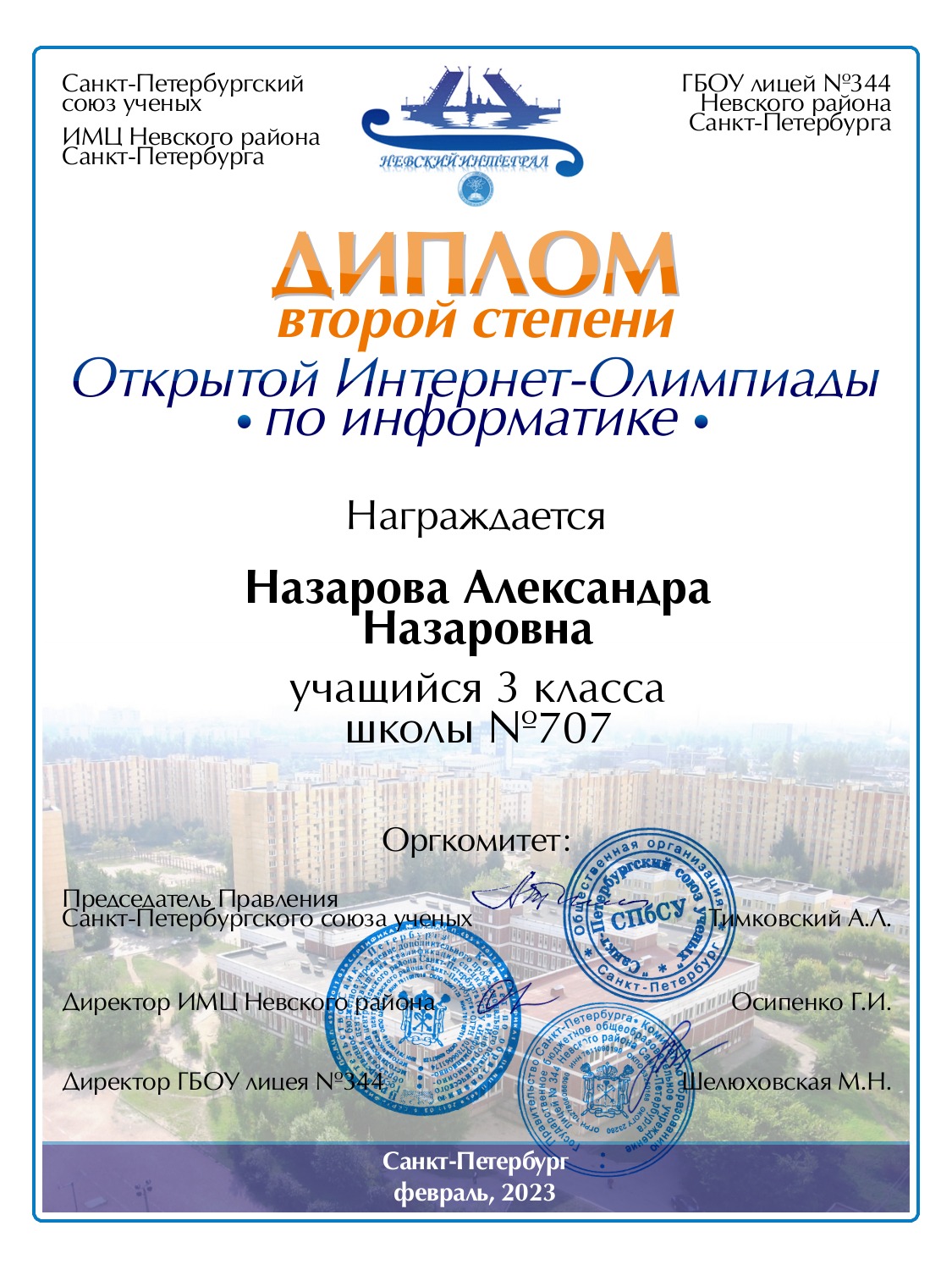 | Назарова | Александра | Назаровна | Санкт-Петербург | 707 | 3 | 80 | Диплом 2 степени |