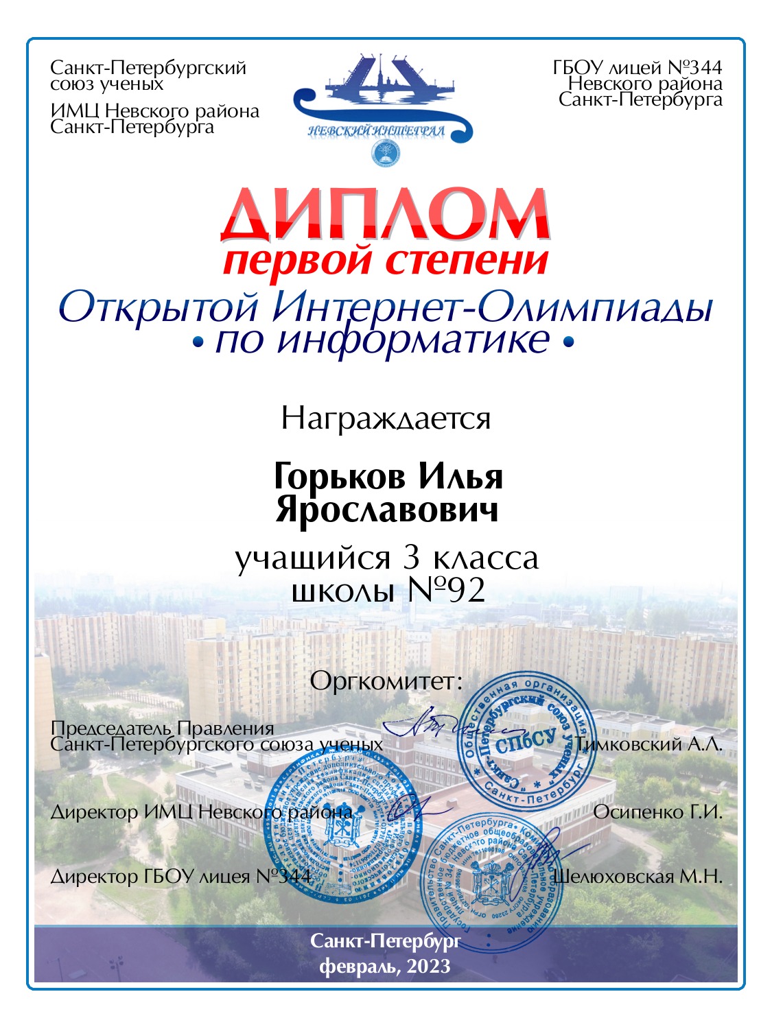 | Горьков | Илья | Ярославович | Санкт-Петербург | 92 | 3 | 100 | Диплом 1 степени |