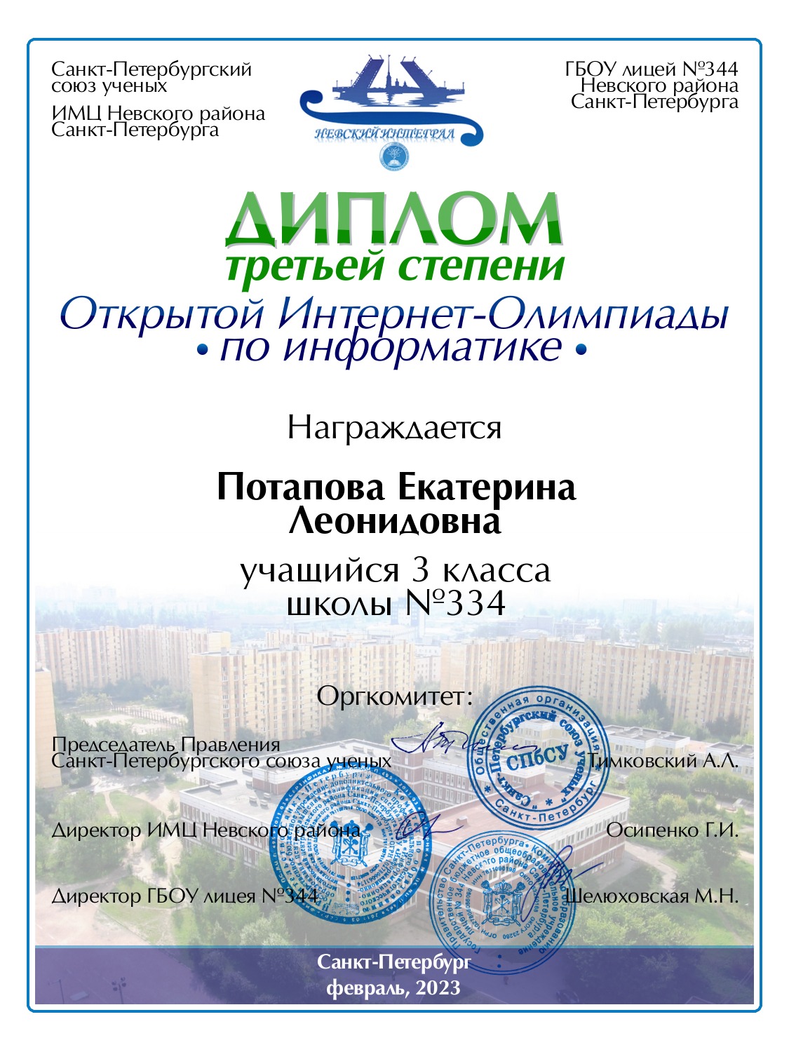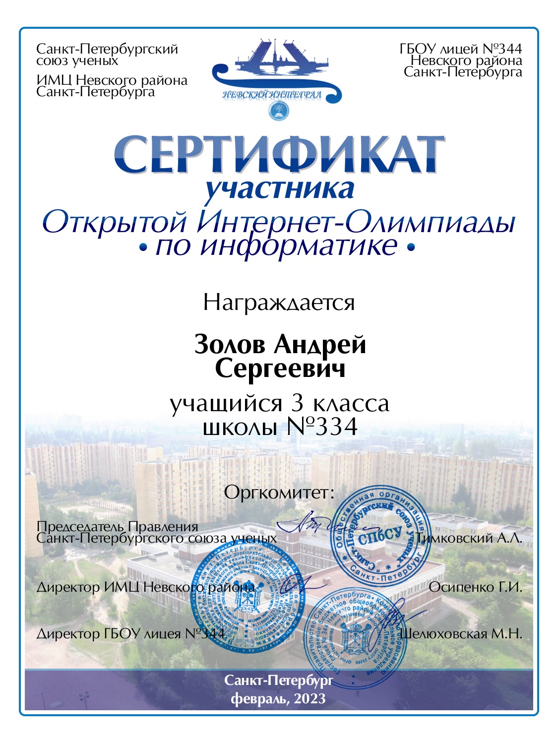 | Золов | Андрей | Сергеевич | Санкт-Петербург | 334 | 3 | N | Сертификат |