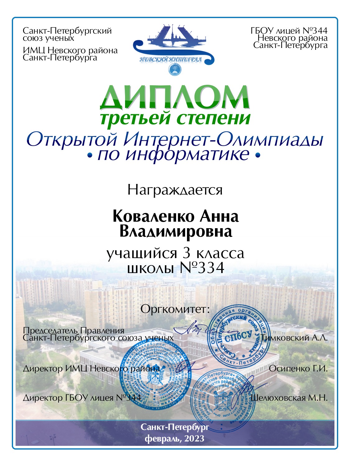 | Коваленко | Анна | Владимировна | Санкт-Петербург | 334 | 3 | 60 | Диплом 3 степени |