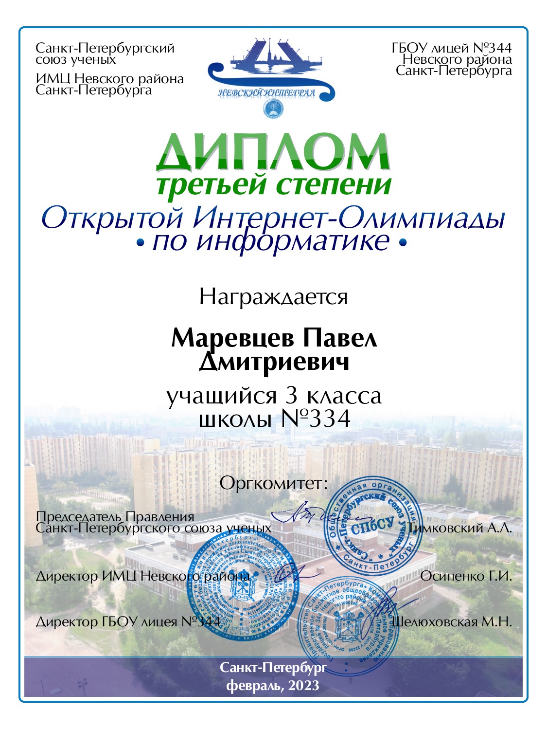 | Маревцев | Павел | Дмитриевич | Санкт-Петербург | 334 | 3 | 60 | Диплом 3 степени |
