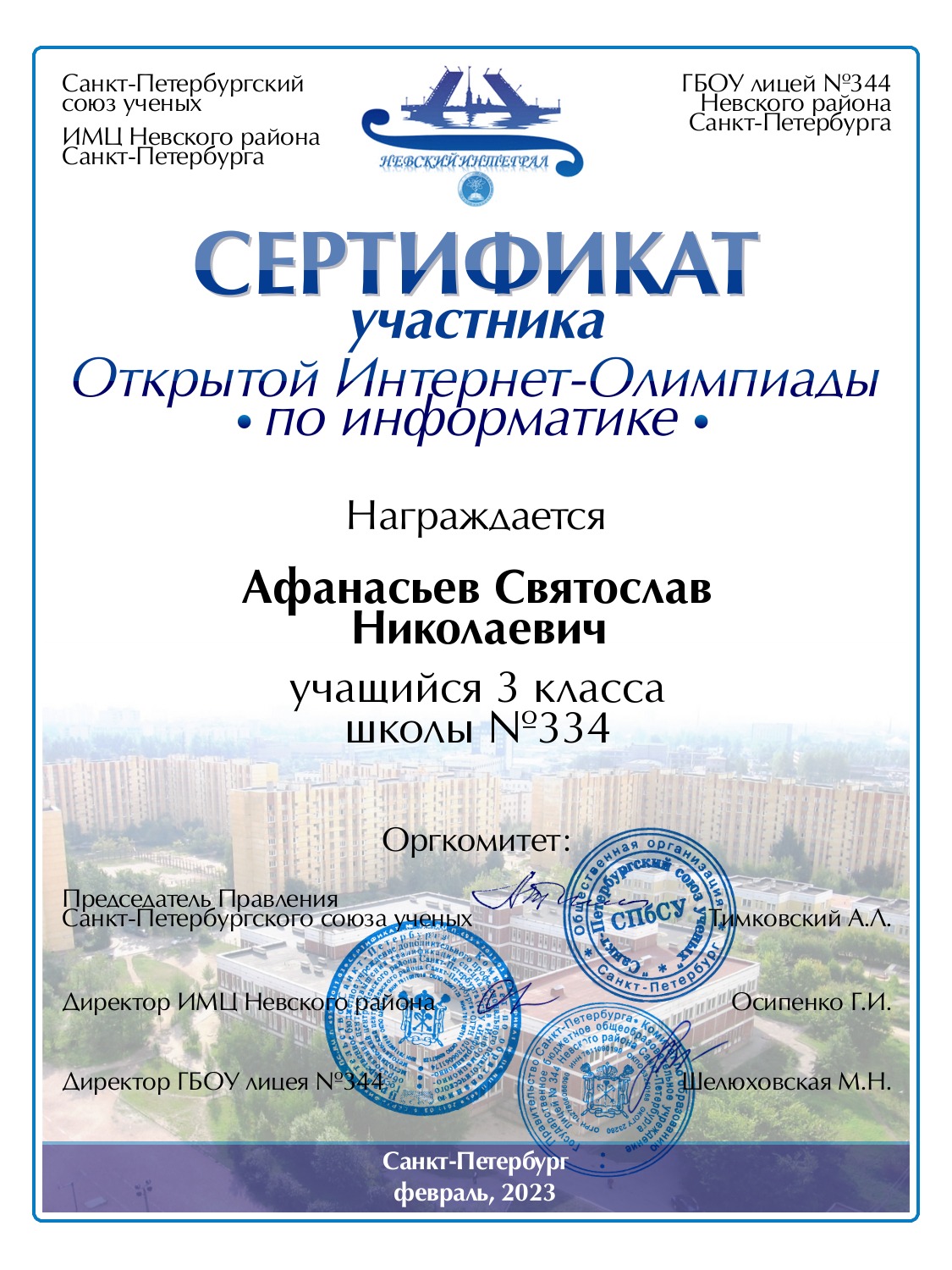 | Афанасьев | Святослав | Николаевич | Санкт-Петербург | 334 | 3 | 40 | Сертификат |