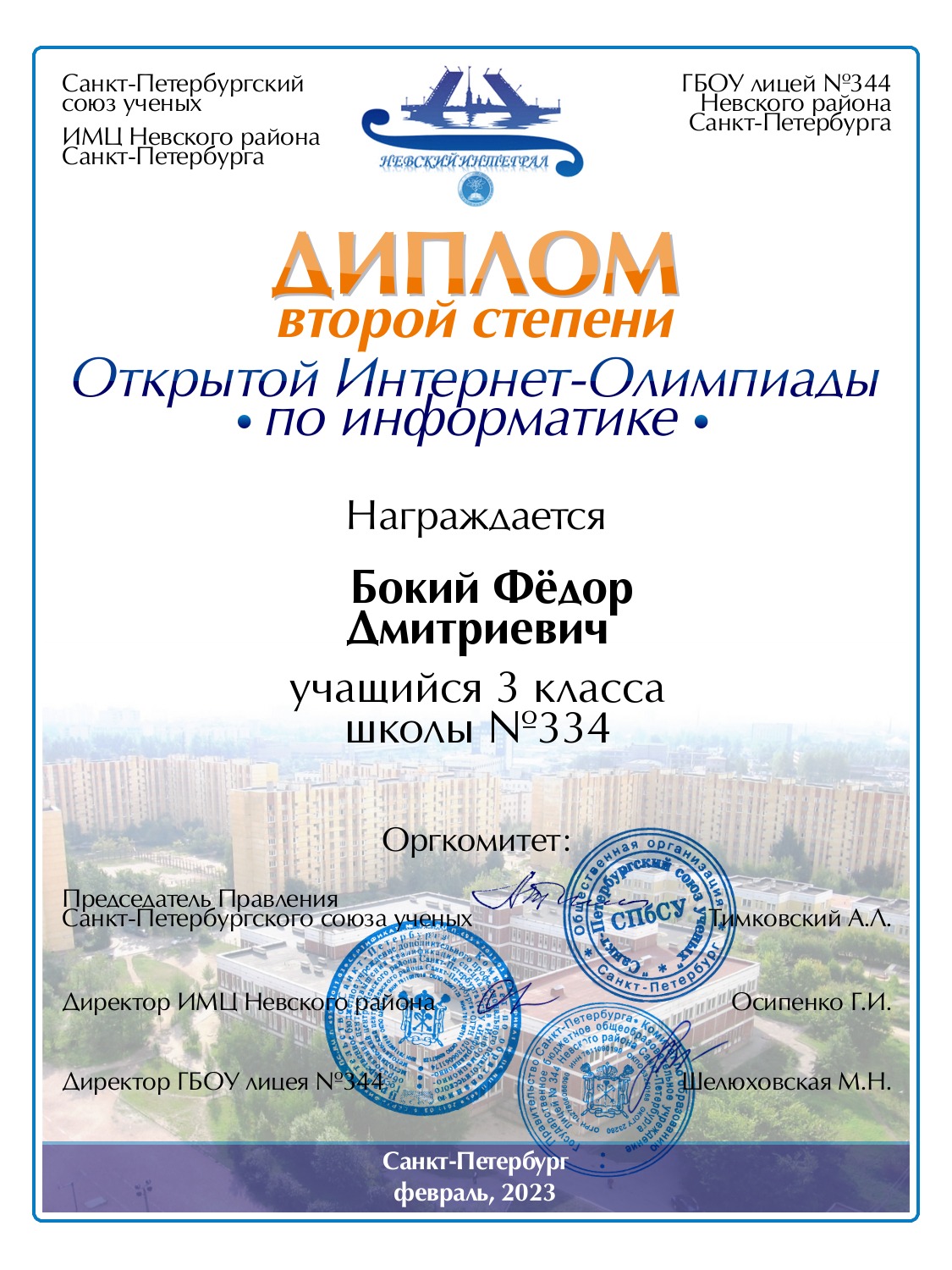 | Бокий | Фёдор | Дмитриевич | Санкт-Петербург | 334 | 3 | 80 | Диплом 2 степени |