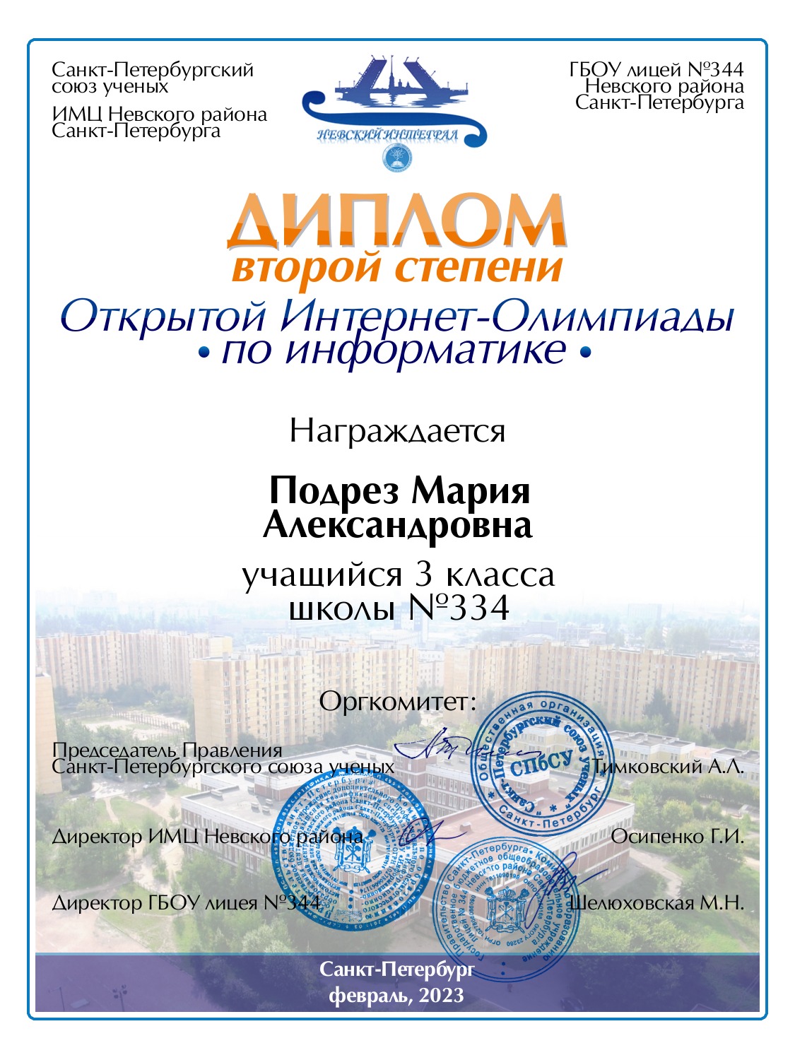 | Подрез | Мария | Александровна | Санкт-Петербург | 334 | 3 | 80 | Диплом 2 степени |