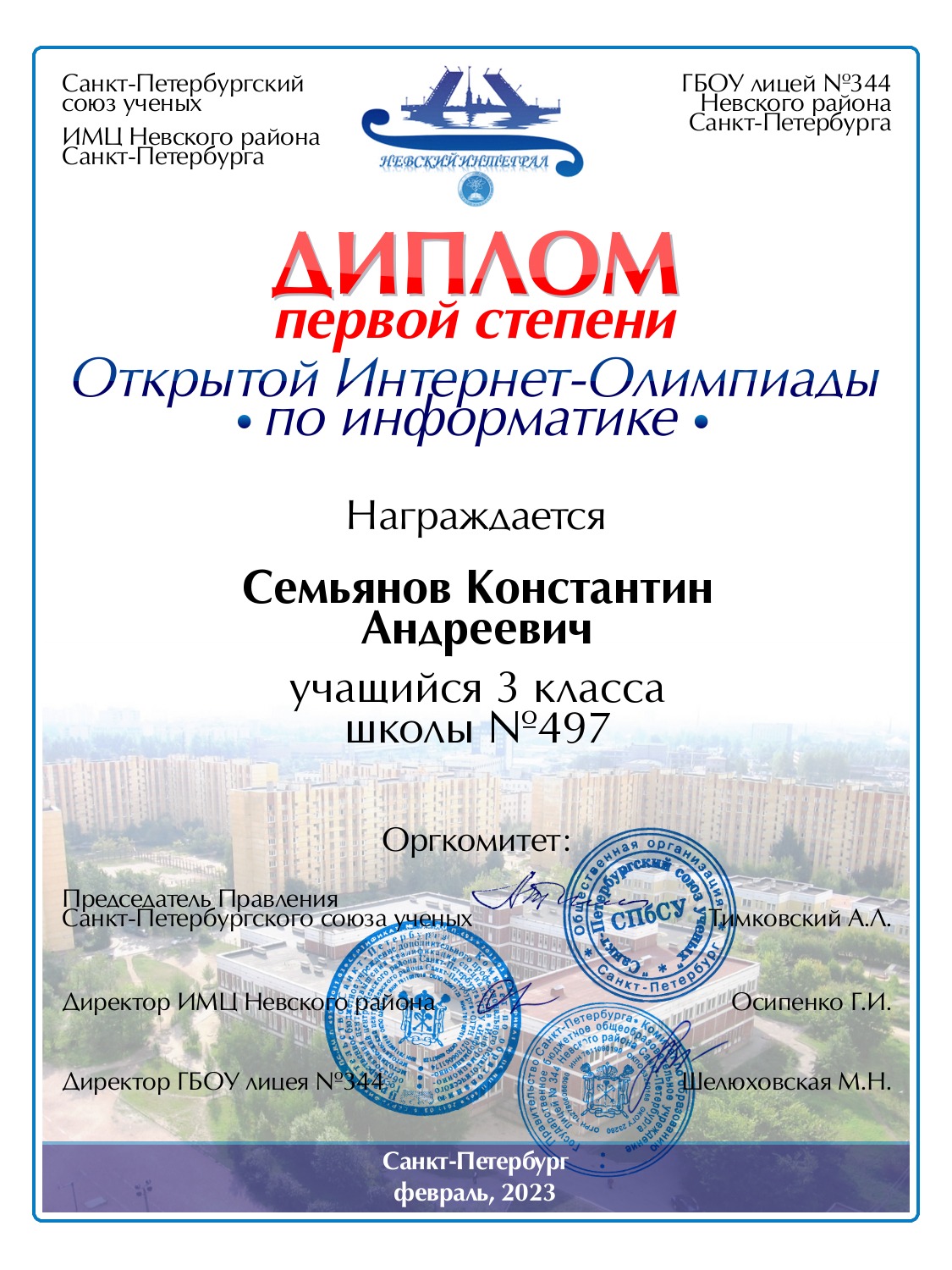 | Семьянов | Константин | Андреевич | Санкт-Петербург | 497 | 3 | 100 | Диплом 1 степени |