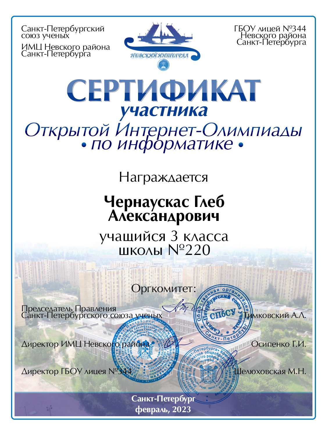 | Чернаускас | Глеб | Александрович | Санкт-Петербург | 220 | 3 | 40 | Сертификат |