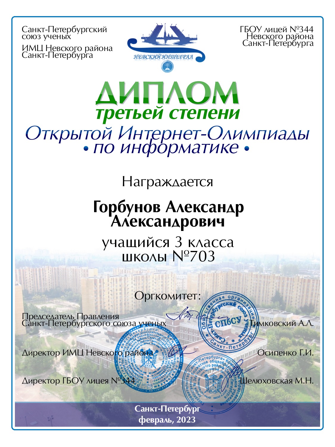 | Горбунов | Александр | Александрович | Санкт-Петербург | 703 | 3 | 60 | Диплом 3 степени |