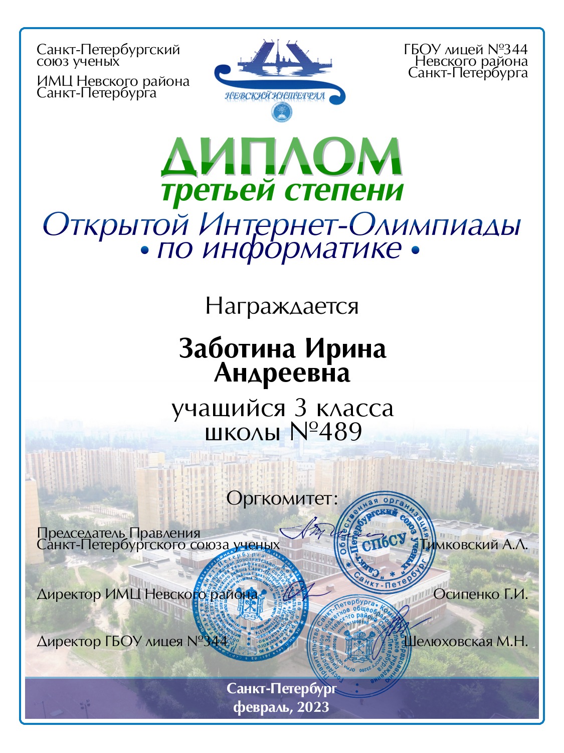 | Заботина | Ирина | Андреевна | Санкт-Петербург | 489 | 3 | 60 | Диплом 3 степени |