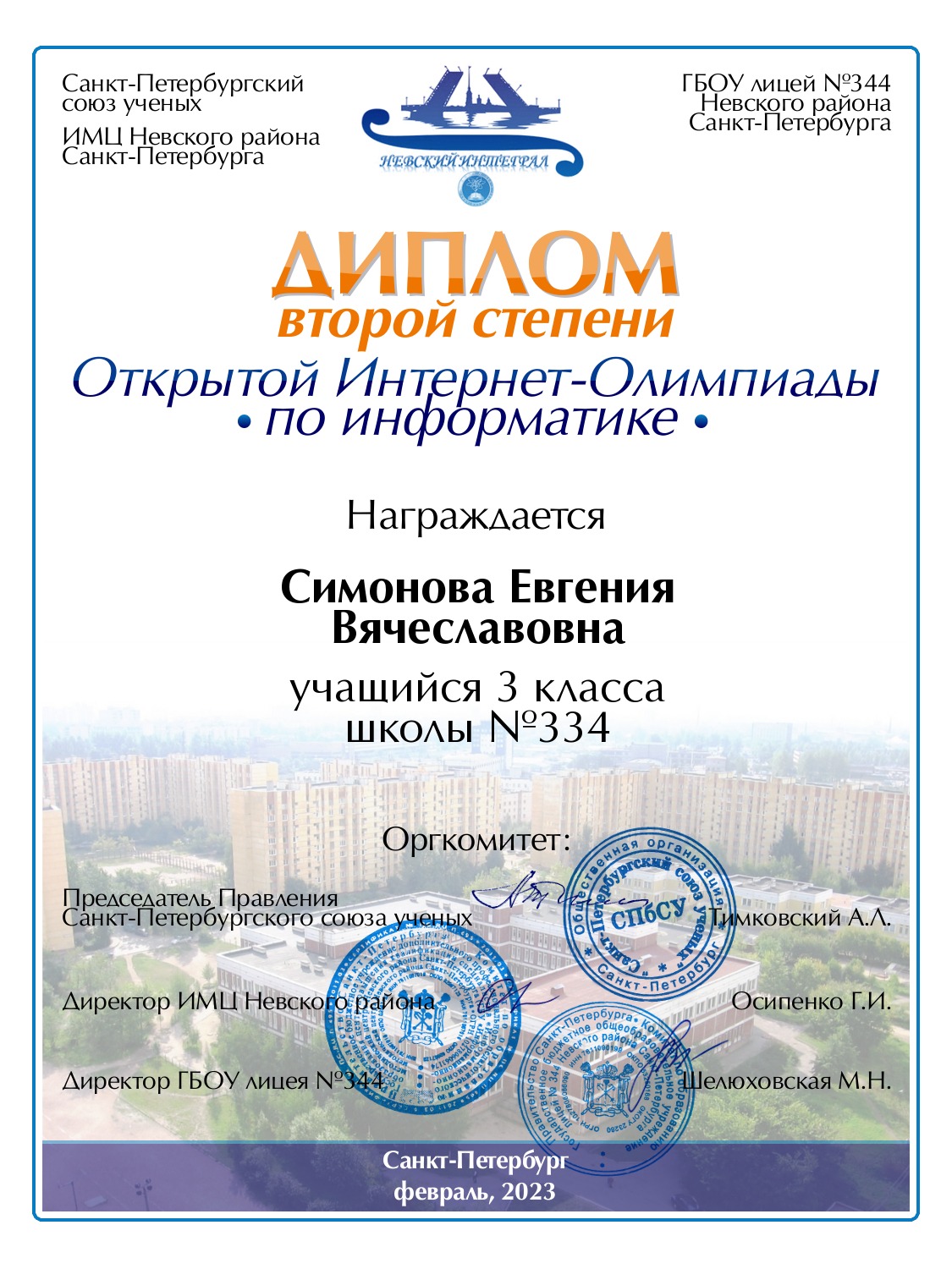 | Симонова | Евгения | Вячеславовна | Санкт-Петербург | 334 | 3 | 80 | Диплом 2 степени |