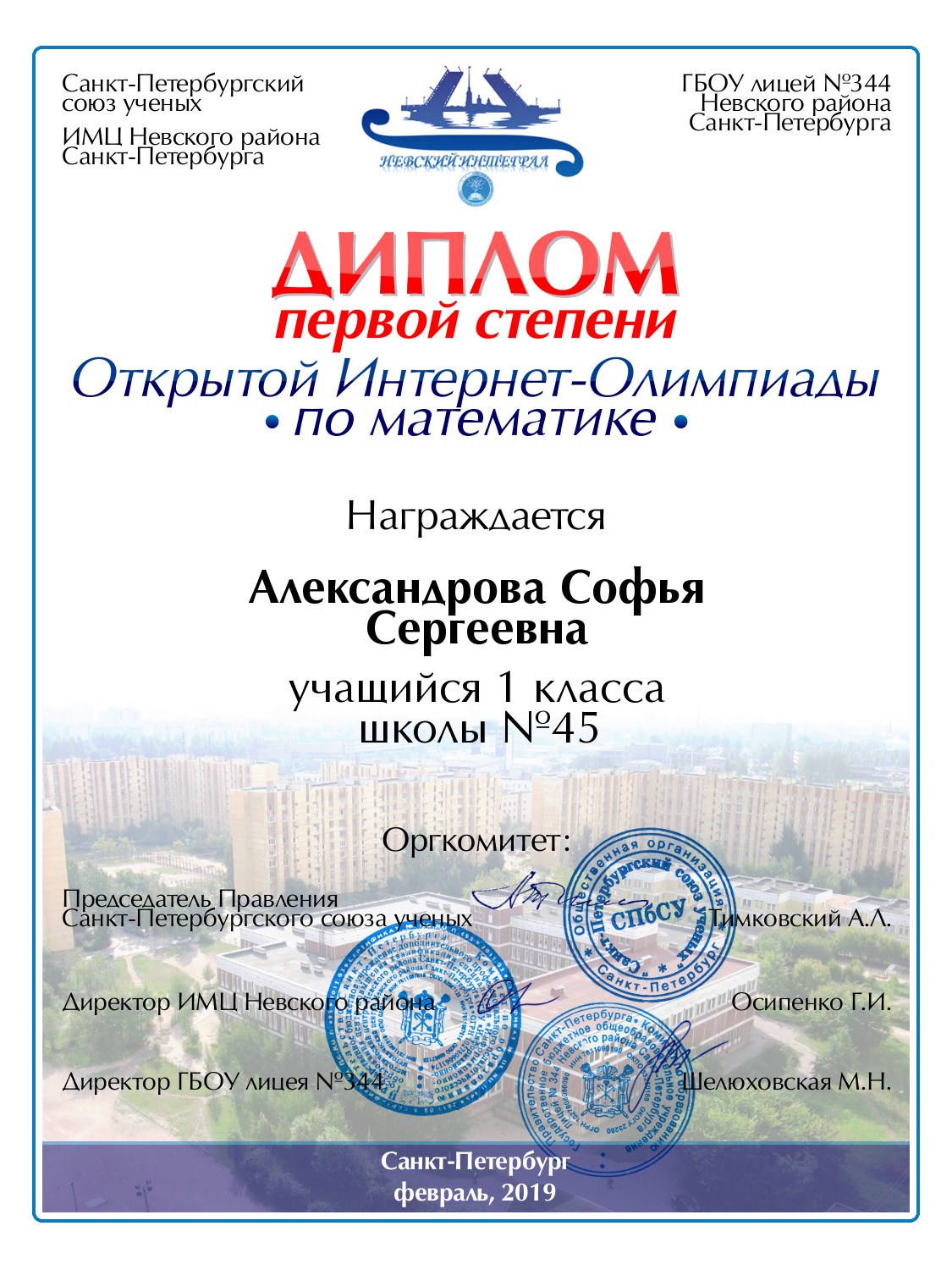| Миронова | Алина | Романовна | Санкт-Петербург | 344 | 1 | 63 | Сертификат |