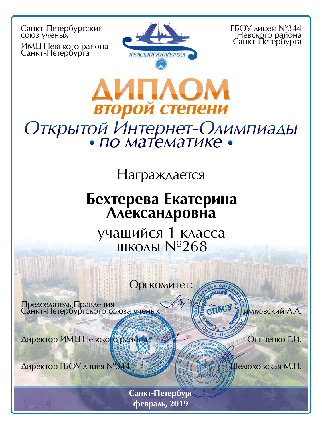 | Логиневская | Екатерина | Андреевна | Санкт-Петербург | 690 | 1 | 88 | Диплом 2 степени |