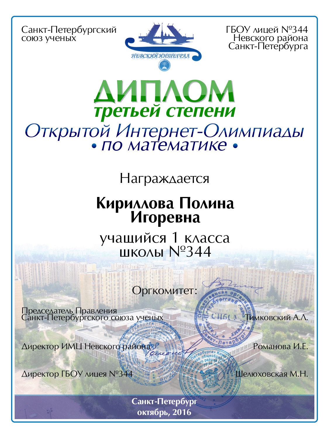 | Кириллова | Полина | Игоревна | Санкт-Петербург | 344 | 1 | 75 | Диплом 3 степени |