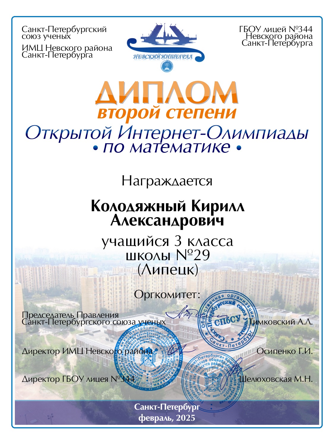 | Аксенов | Кирилл | Сергеевич | Липецк | 29 | 3 | 100 | Диплом 1 степени |